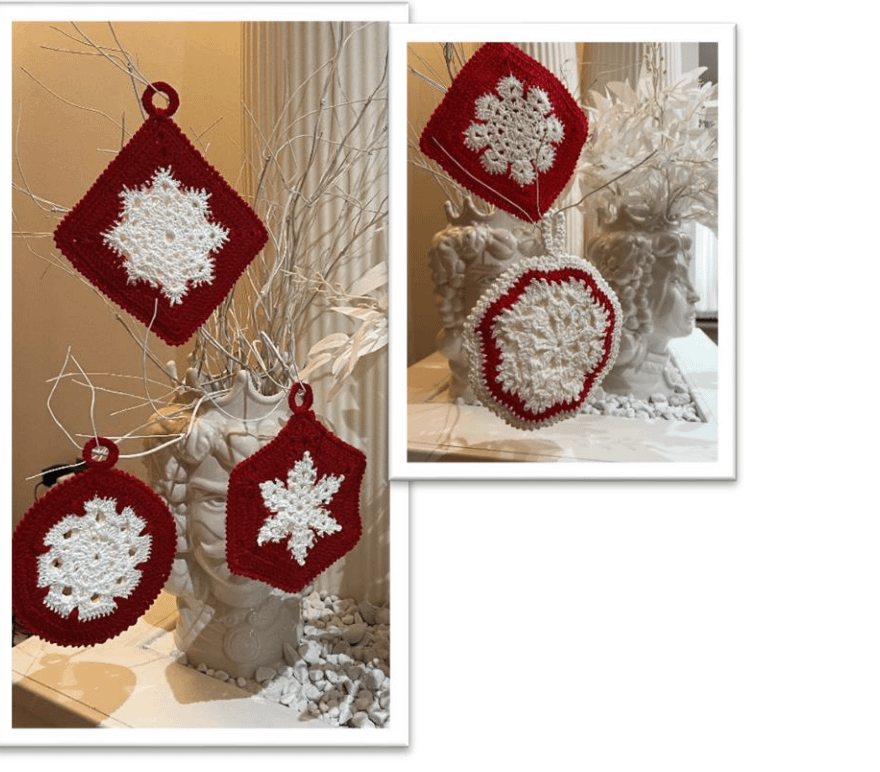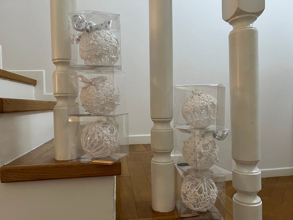 Palle eseguite con motivi diversi in puro cotone bianco o a richiesta verde o rosso. Interno pvc, con o senza perline, confezionate in scatole trasparenti.