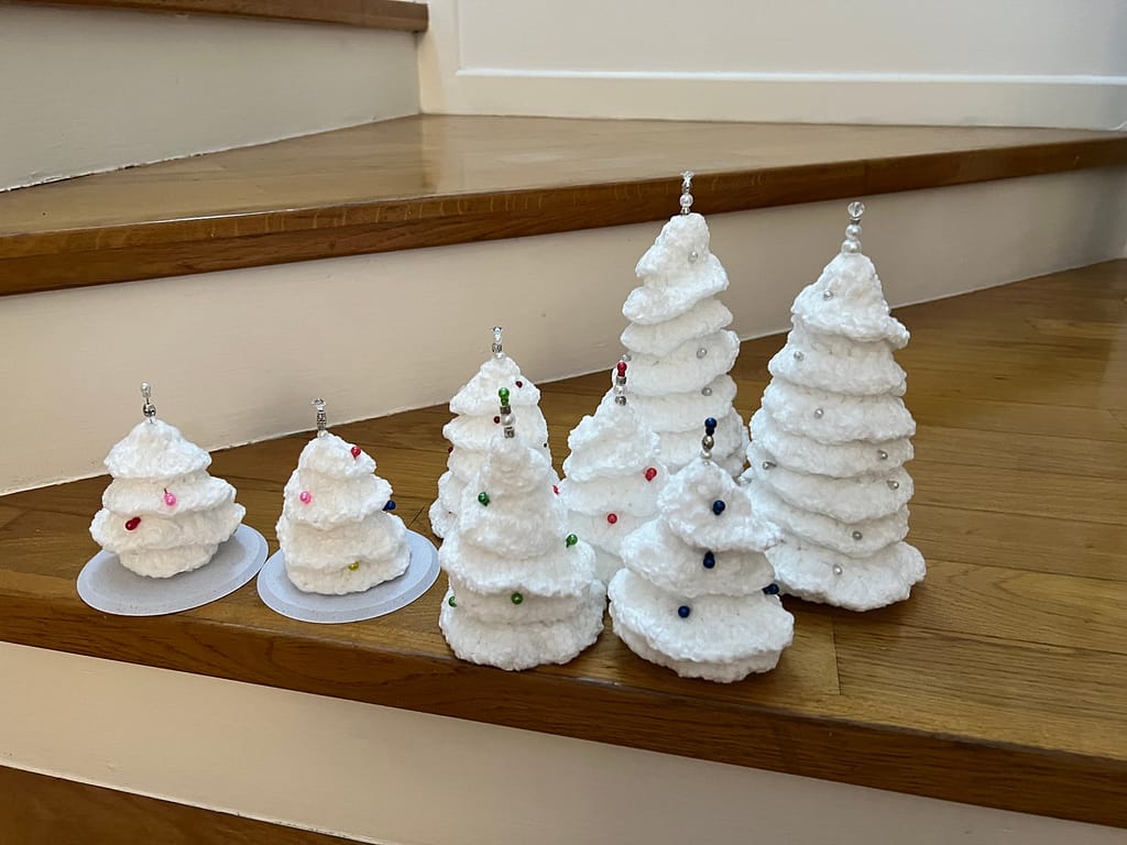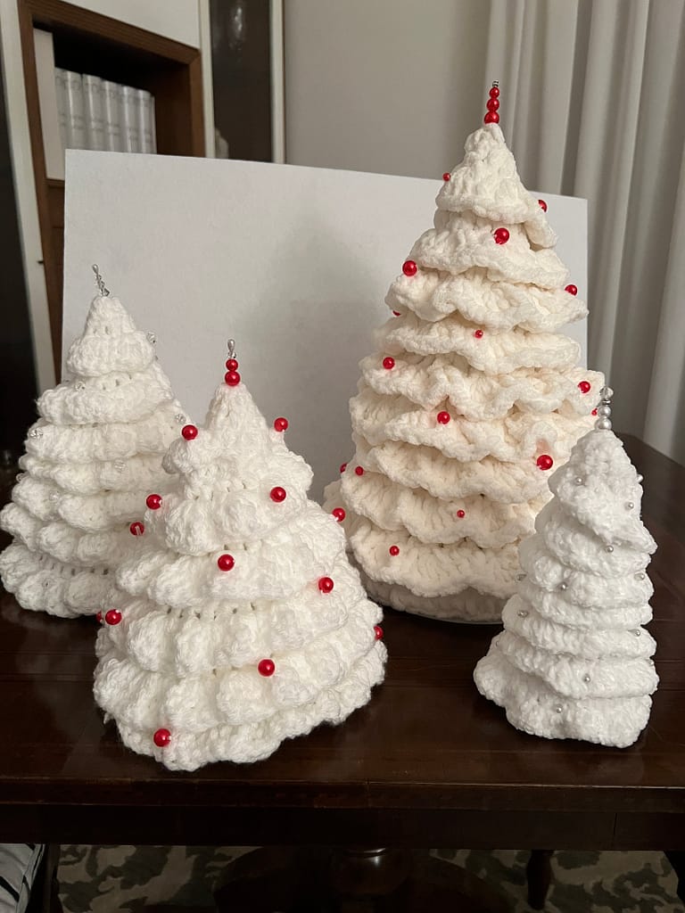 Albero creato con soffice lana bianca, supporto interno in stampante 3D perline rosse o bianche.